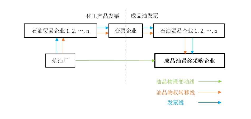税务机关执法的一个重要线索就是发票。如果发票上的货物品名由化工产品变成了成品油,则可能被税务机关认为发生了消费税应税行为。为了对税务机关隐藏成品油生产环节,石化行业普遍在炼厂生产成品油环节不变更发票品名,而是经由变票公司完成变票。具体来说,通常是卖方与成品油最终采购企业谈定交易,由炼厂完成成品油生产,成品油直接被运输至最终采购企业完成交易。同时,为了掩盖炼油环节来逃避消费税,炼厂对外仍开具化工产品发票(没有缴纳消费税),发票经过中间贸易企业后,再经由变票企业变为成品油发票,再经过中间贸易企业,最后开给成品油最终采购方(也有的交易先经变票公司变票后,再由炼油厂生产销售,也有的交易中发票流转不经过炼厂环节)。这就导致油品交易线上油品在物理上的转移与发票上载明的购销交易方不一致。